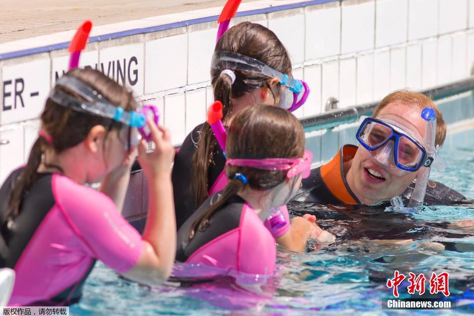 威廉王子穿潜水装跟小萝莉一起戏水