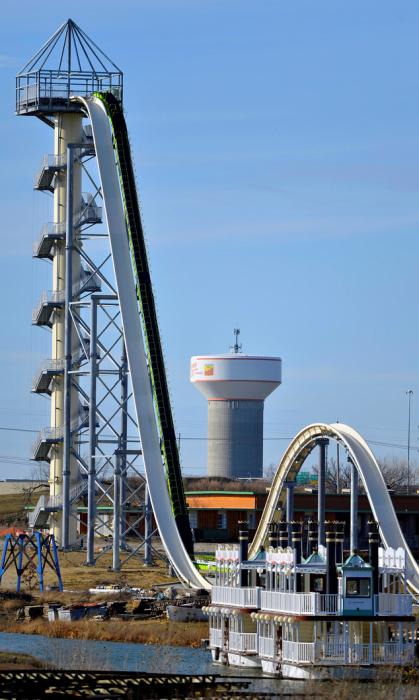 据英国《每日邮报》2014年7月9日报道,美国堪萨斯城建成一座世界上最高最快的水滑梯,168英尺高,大约17层楼高。这个水道专门为那些肾上腺分泌过多的人设计,如果你在爬完264级台阶还没退缩的话,你会乘坐专门设计的划水车同其他3个个人一同感受地心引力的召唤,17层楼高!超过100公里每小时的速度!