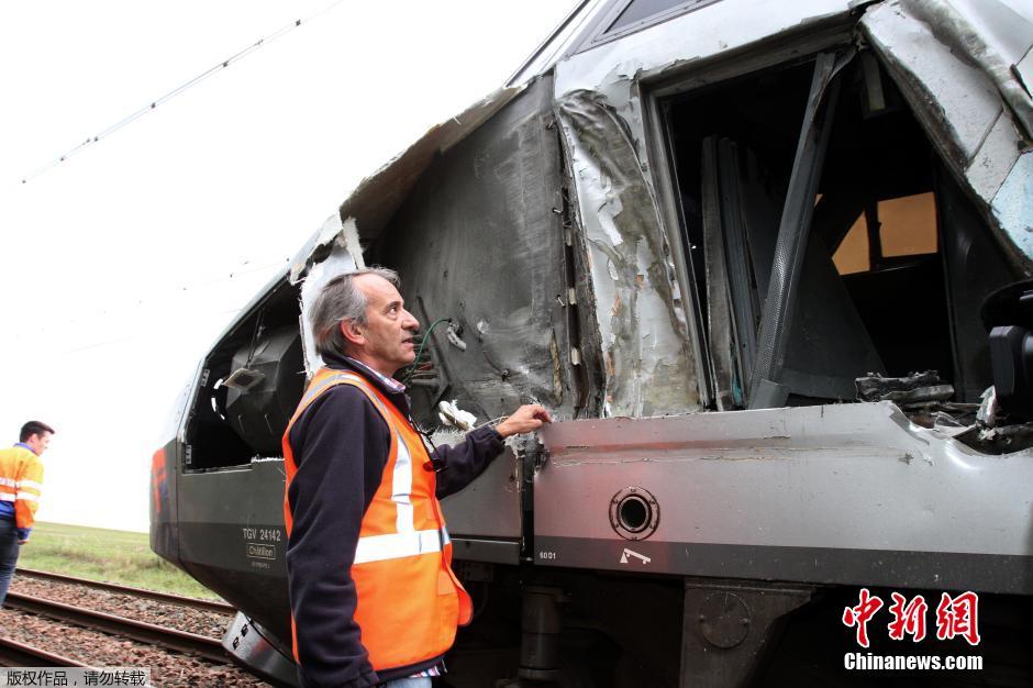 当地时间7月10日,法国Ade,法国铁路公司的员工和士兵检查一列高铁的损失情况,这列高铁列车当天与一辆卡车相撞,导致列车员轻伤。事发时,列车上没有乘客,运行在卢尔德和塔布之间,相撞的卡车上装载着碎石。