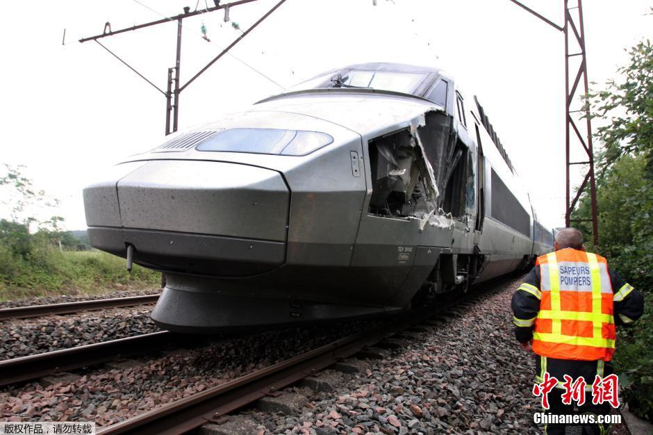 当地时间7月10日,法国Ade,法国铁路公司的员工和士兵检查一列高铁的损失情况,这列高铁列车当天与一辆卡车相撞,导致列车员轻伤。事发时,列车上没有乘客,运行在卢尔德和塔布之间,相撞的卡车上装载着碎石。
