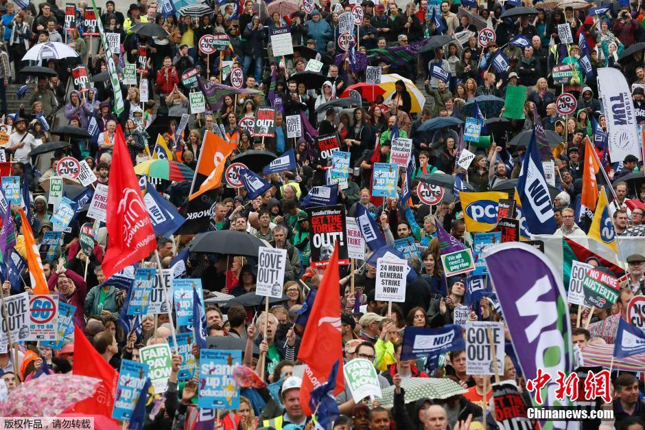 当地时间2014年7月10日,英国伦敦,数千教师、消防员、议会人员以及其他市民一同参加在伦敦举行的24小时罢工游行。参与者因薪酬、养老金的减少抗议政府。