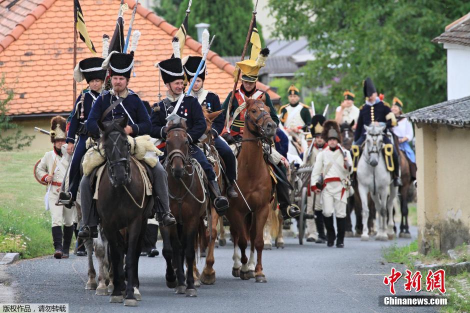 当地时间2014年7月10日,奥地利塞费尔德,参与者穿着奥地利士兵的服装重现拿破仑从塞费尔德进军捷克的场面,纪念兹诺伊莫战役。