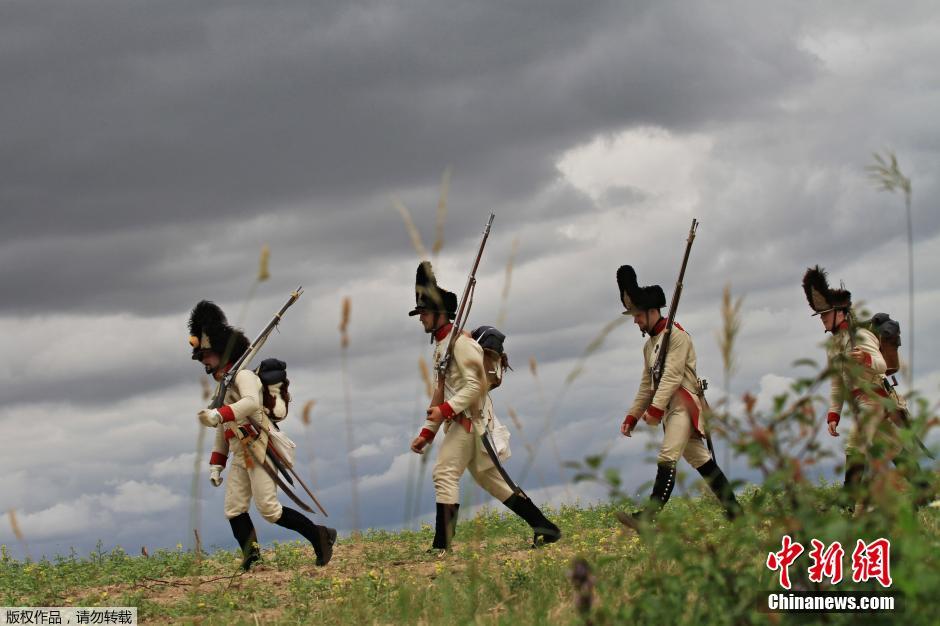 当地时间2014年7月10日,奥地利塞费尔德,参与者穿着奥地利士兵的服装重现拿破仑从塞费尔德进军捷克的场面,纪念兹诺伊莫战役。