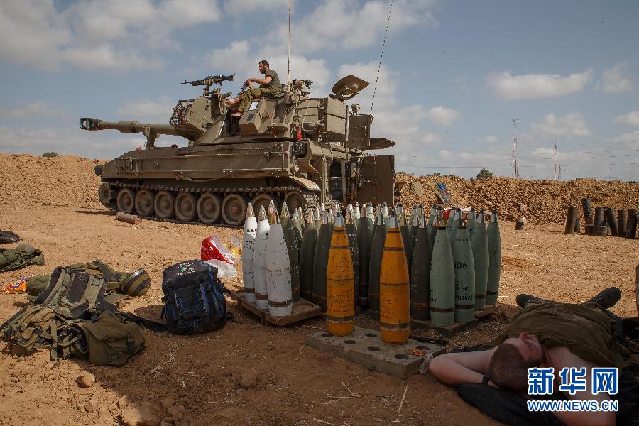 7月13日,在以色列南部与加沙的边境,一名以军犹太士兵(左)在一门自行榴弹炮旁祷告。