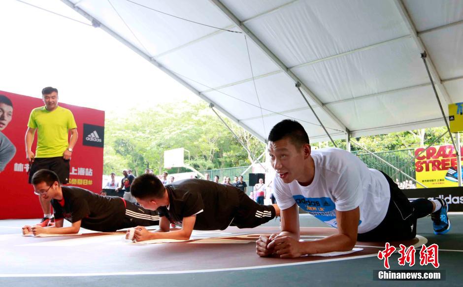 7月14日,华裔篮球巨星林书豪现身上海徐家汇篮球公园,继续他的2014中国行之旅。现场林书豪与大家分享了转会洛杉矶湖人队后的即时感受,并和现场的小球员们玩起了篮球游戏。图为林书豪用手势比出LA字样,向球迷表达转会湖人后的欣喜。中新社发 申海 摄