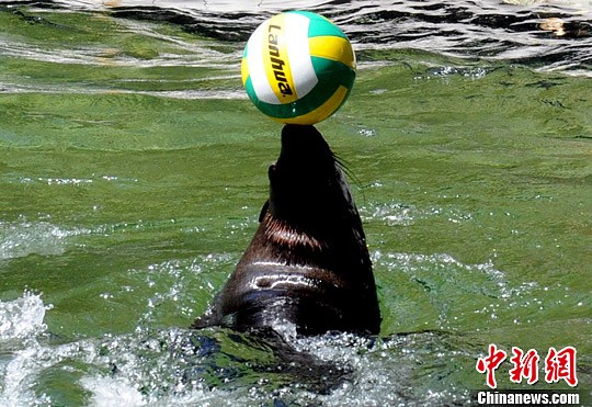 福州动物园海狮明星,为游客精彩表演水中顶球。刘可耕 摄