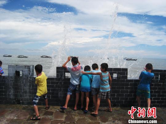 广西沿海大潮期至 游客古渔村“与浪共舞”