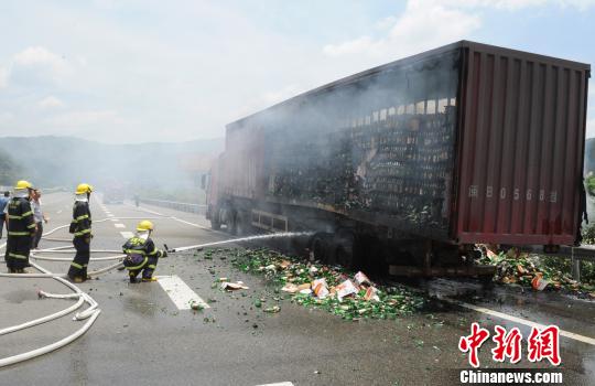 7月13日中午,沈海高速福清宏路出口朝福州方向约100米路段,一辆满载啤酒的大货车发生自燃,福州消防支队接警后迅速出动警力将火势扑灭,所幸无人员伤亡。刘可耕 摄