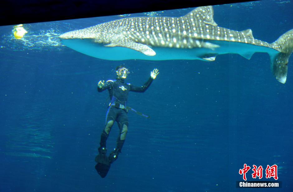7月15日,长隆幸福大使田亮、森碟和叶一茜到珠海长隆海洋王国,在世界最大的海洋鱼类展馆“鲸鲨馆”里,田亮与新入驻的两条鲸鲨共舞海底芭蕾,抚摸鲸鲨,给鲸鲨喂食,并与鲸鲨合作,做出各种高难度与美感兼具的动作。中新社发 刘卫勇 摄