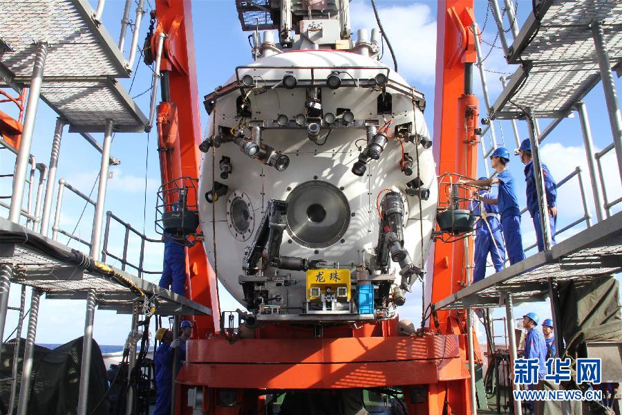 当日,“蛟龙”号载人潜水器开展2014至2015年试验性应用航次第一次下潜作业,主要目的是检验潜水器在不同深度的水下作业技术状态。本次下潜将采集海底沉积物和近底水样,拍摄海底富钴结壳和巨型底栖生物高清视像资料,并验证“蛟龙”号搭载的微型缆控机器人(ROV)“龙珠”的各项功能。新华社记者 罗沙 摄