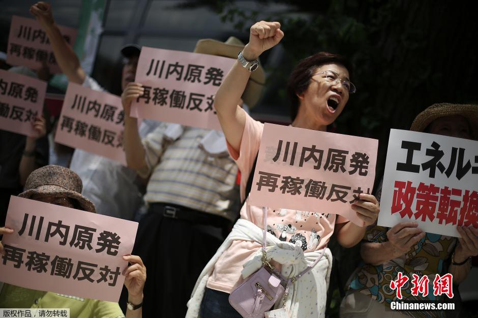 当地时间7月16日上午,日本民众在东京都港区原子能规制委员会所在的大厦前集会抗议川内核电站1、2号机组通过安全审查。
