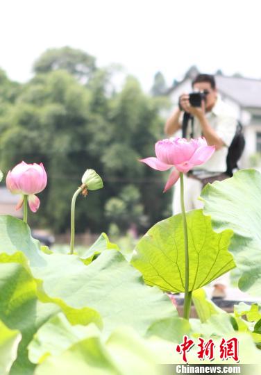图为重庆铜梁爱莲湖湿地公园万亩荷花盛开,吸引市民前来拍照留念。 周毅 摄