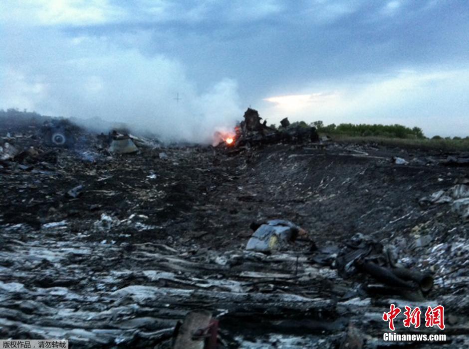 7月17日,据路透社消息,马来西亚一架载有295人的777客机在乌克兰靠近俄罗斯边界坠毁。另据国际文传电讯社消息,坠毁机型为一架波音777客机,机载约280名乘客和15个机组人员。马来西亚航空公司确认,该公司从阿姆斯特丹飞往吉隆坡的MH17航班失联,并称最后与该客机取得联系的地点在乌克兰上空。乌克兰空管部门随后证实马航MH17航班坠毁。乌克兰内政部幕僚表示,这一航班在顿涅茨克地区上空被击落。图为马航波音777客机在顿涅茨克地区坠毁的现场。