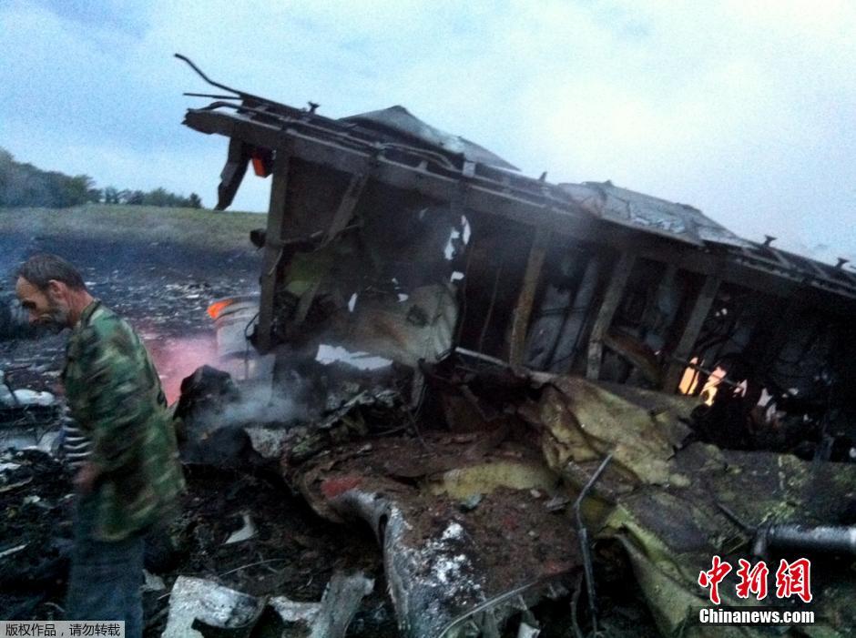 7月17日,据路透社消息,马来西亚一架载有295人的777客机在乌克兰靠近俄罗斯边界坠毁。另据国际文传电讯社消息,坠毁机型为一架波音777客机,机载约280名乘客和15个机组人员。马来西亚航空公司确认,该公司从阿姆斯特丹飞往吉隆坡的MH17航班失联,并称最后与该客机取得联系的地点在乌克兰上空。乌克兰空管部门随后证实马航MH17航班坠毁。乌克兰内政部幕僚表示,这一航班在顿涅茨克地区上空被击落。图为马航波音777客机在顿涅茨克地区坠毁的现场。