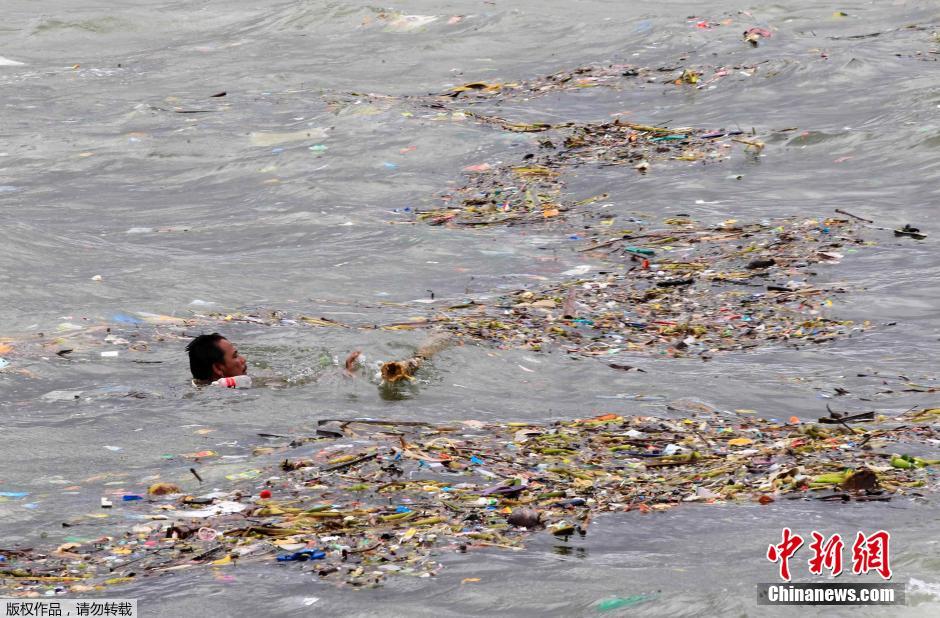 台风“威马逊”袭击菲律宾 垃圾布满海面