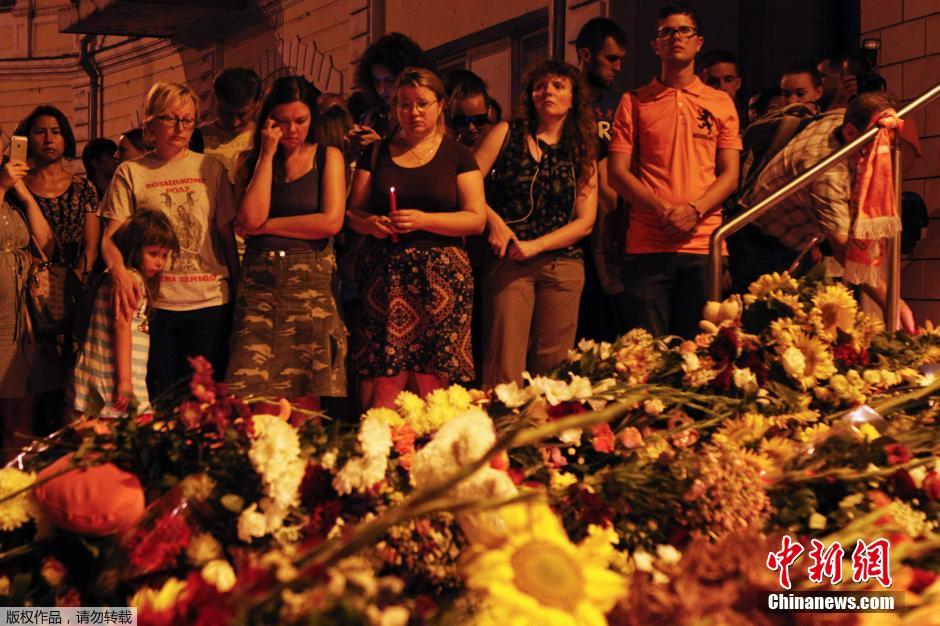 7月17日,乌克兰基辅,民众们手持鲜花和蜡烛在荷兰驻乌大使馆前悼念马航MH17事故遇难者。综合外媒报道,当地时间7月17日,马来西亚航空公司 MH17航班在俄乌边境坠毁。多方消息称,飞机是被击落的。截至目前,此次客机坠毁事故尚未发现任何生还者的迹象,据称,该架飞机上所载人数为298人,而此前报道称飞机上共载295人。由于此次事件可能导致地面人员伤亡,总共的遇难人数将超过300人。