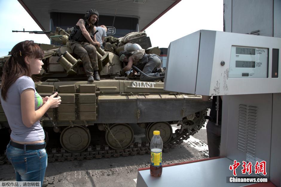 当地时间7月17日,顿涅茨克地区,“顿涅茨克共和国”士兵在街头给坦克加油,一位女孩在加油站帮助他们。