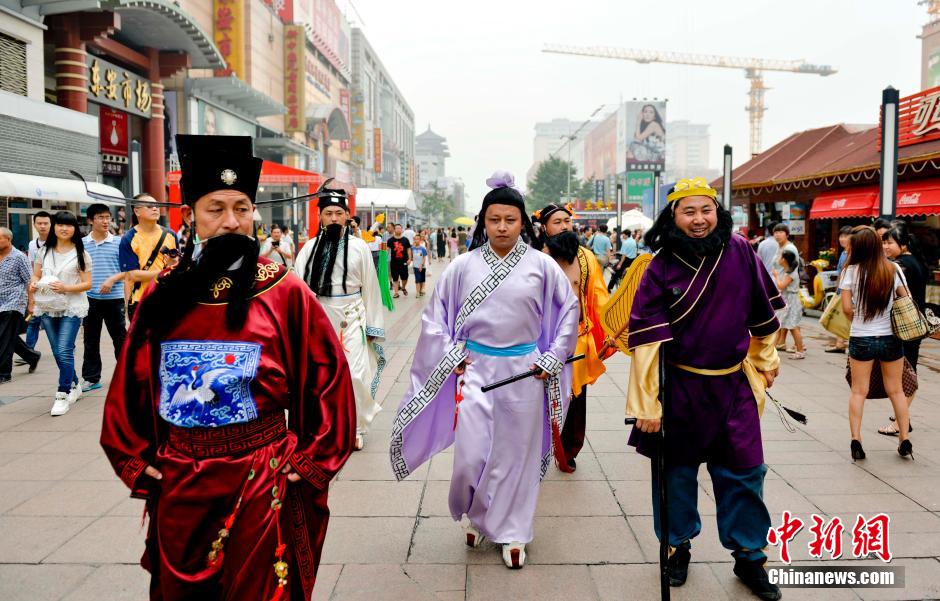 7月17日,以“到蓬莱,过神仙日子”北京活动周在北京王府井步行街拉开帷幕,装扮成吕洞宾、韩湘子、何仙姑等八仙演员在王府井大街上信步闲游。中新社发 陆欣 摄