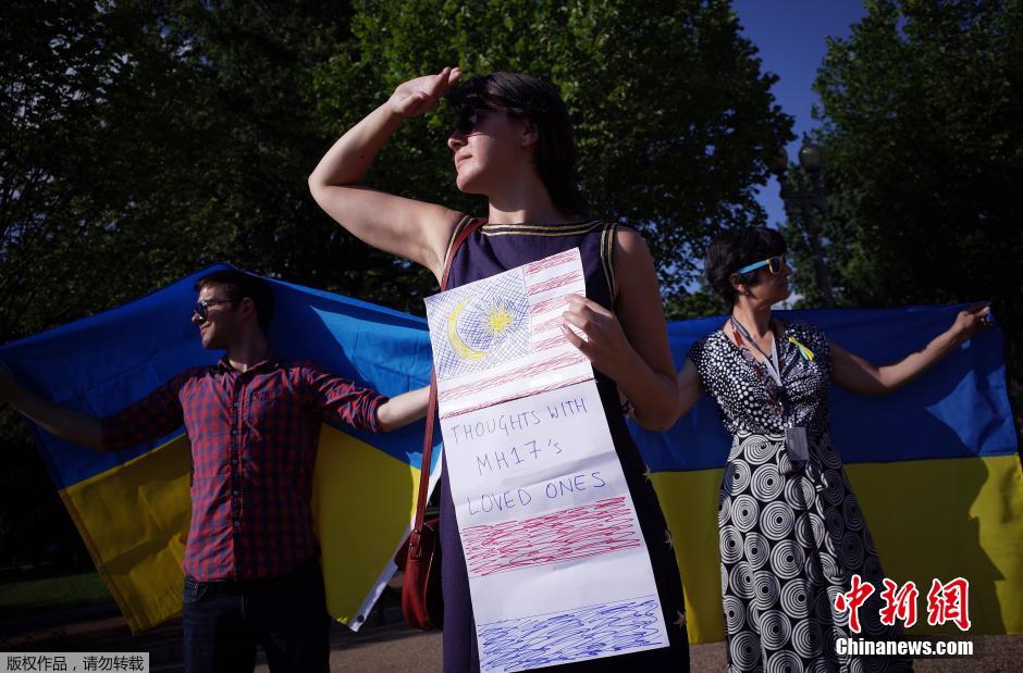 当地时间2014年7月17日,美国白宫,乌克兰政府支持者在白宫外集会,抗议乌国内反对派武装将MH17客机击落。