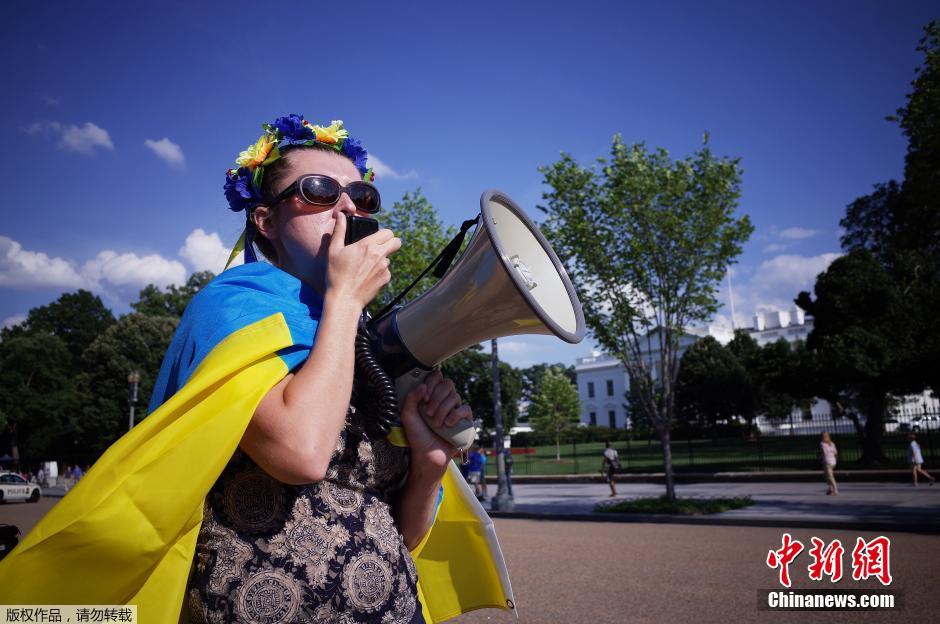 当地时间2014年7月17日,美国白宫,乌克兰政府支持者在白宫外集会,抗议乌国内反对派武装将MH17客机击落。