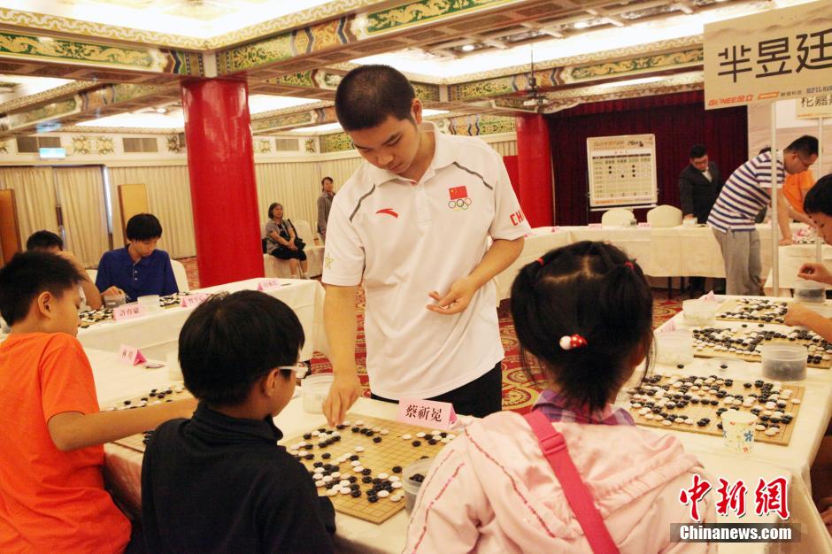 7月17日,海峡两岸围棋冠军争霸赛,经过三天的单循环对弈,在台北落子收官,来自大陆的三名“90后”九段、世界冠军棋手芈昱廷、柁嘉熹、唐韦星分获一、二、三名,同为“90后”的台湾七段棋手王元均作为台湾选拔优胜者参赛,名列第四。图为芈昱廷在比赛结束后,以一对多车轮战方式指导台北青少年棋艺。据悉,该赛事今后将在大陆和台湾轮流举办。中新社发 黄少华 摄