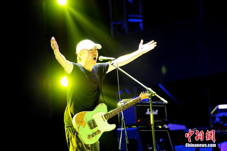7月19日晚,素有“中国摇滚之父”的崔健献演深圳东部华侨城首届“山海音乐节”。当晚,左右乐队、唐朝乐队、眼镜蛇乐队、香港Supper Moment乐队以及根据地重型机车俱乐部“哈雷机车”等精彩上演,现场数千名观众疯狂陶醉在摇滚乐之中。中新社发 陈文 摄