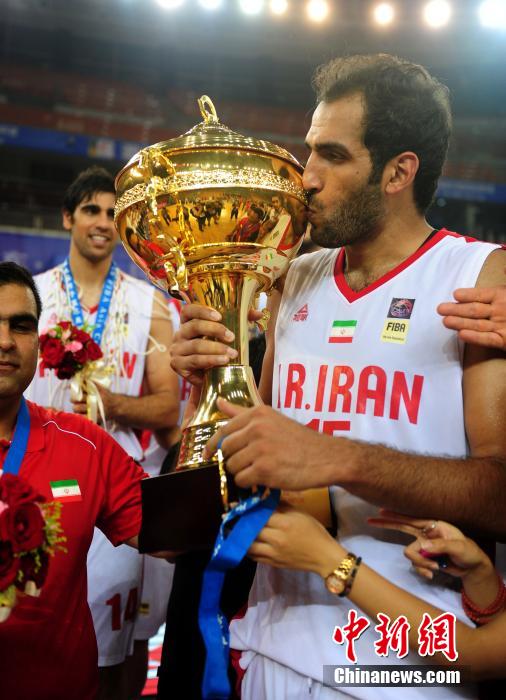 7月19日晚,伊朗队的哈达迪亲吻冠军奖杯。当晚,第5届男篮亚洲杯在武汉进入决赛角逐。伊朗男篮以89-79战胜中华台北男篮,成功卫冕。中新社发 张畅 摄