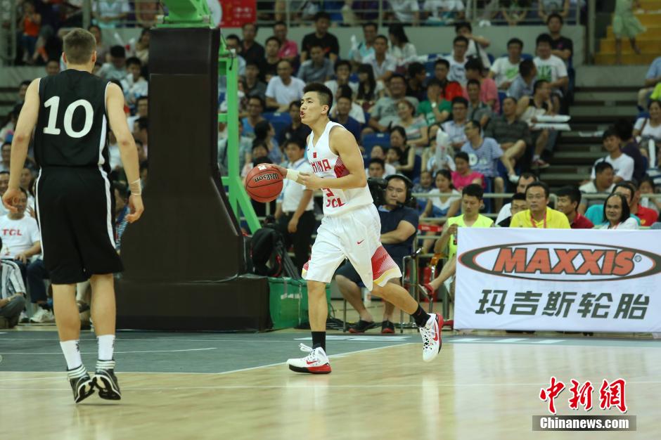 7月19日,玛吉斯杯中欧男篮对抗赛次日赛事展开争夺,中国男篮以72比67战胜德国队,赢得本站赛事首胜。王哲林回归先发位置,并在上半场表现出色砍下了11分5篮板。但由于下半场犯规过多,没能再有出彩表现。郭艾伦表现抢眼,全场拿到20分9次助攻,成为中国男篮历史上第一个打出这一数据的球员。中新社发 傅正升 摄