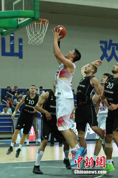 7月19日,玛吉斯杯中欧男篮对抗赛次日赛事展开争夺,中国男篮以72比67战胜德国队,赢得本站赛事首胜。王哲林回归先发位置,并在上半场表现出色砍下了11分5篮板。但由于下半场犯规过多,没能再有出彩表现。郭艾伦表现抢眼,全场拿到20分9次助攻,成为中国男篮历史上第一个打出这一数据的球员。中新社发 傅正升 摄