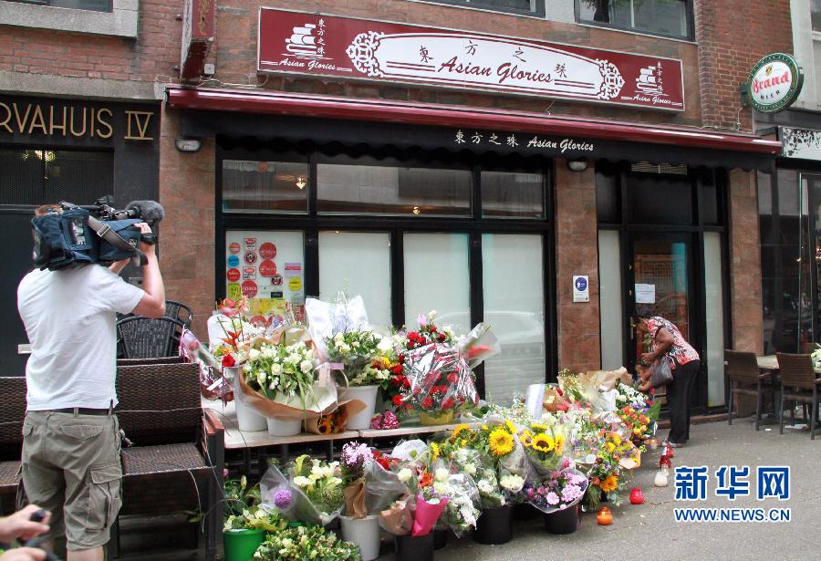 7月19日,在荷兰鹿特丹,民众在马航空难中遇难的香港居民所经营的餐厅前送上鲜花,以示哀悼。中国外交部发言人洪磊18日证实,在乌克兰东部坠毁的马航MH17航班上的乘客中有一名香港居民。据悉,这名乘客是荷兰鹿特丹一家中餐馆的业主。潘治 摄