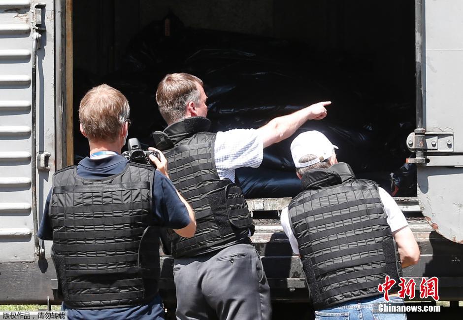 当地时间2014年7月20日,乌克兰顿涅茨克Torez,马航坠机遇难乘客遗体被装上列车冷藏车厢将被运走。载有部分遗体的火车从距空难现场不远的乌克兰托列兹市出发,前往顿涅茨克市。火车离站前,身处空难现场的欧洲安全与合作组织(欧安组织)代表检查了运载遗体的5节冷藏车厢。