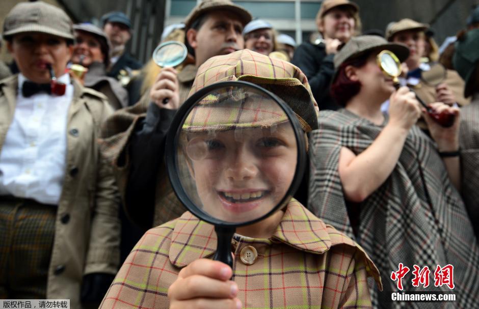 当地时间2014年7月19日,英国伦敦,民众头戴猎鹿帽、身着斗篷、手持烟斗和放大镜,装扮成小说中的虚构人物福尔摩斯,试图创造最多人假扮福尔摩斯集会的吉尼斯纪录。这一活动是由MX出版社为筹款出版一本图书而组织的,该书讲述一家内罗毕孤儿院的故事。书籍出版销售后的全部收入将投入到推广这家孤儿院在肯尼亚孤儿的教育和领养方面的伟大事业中去。