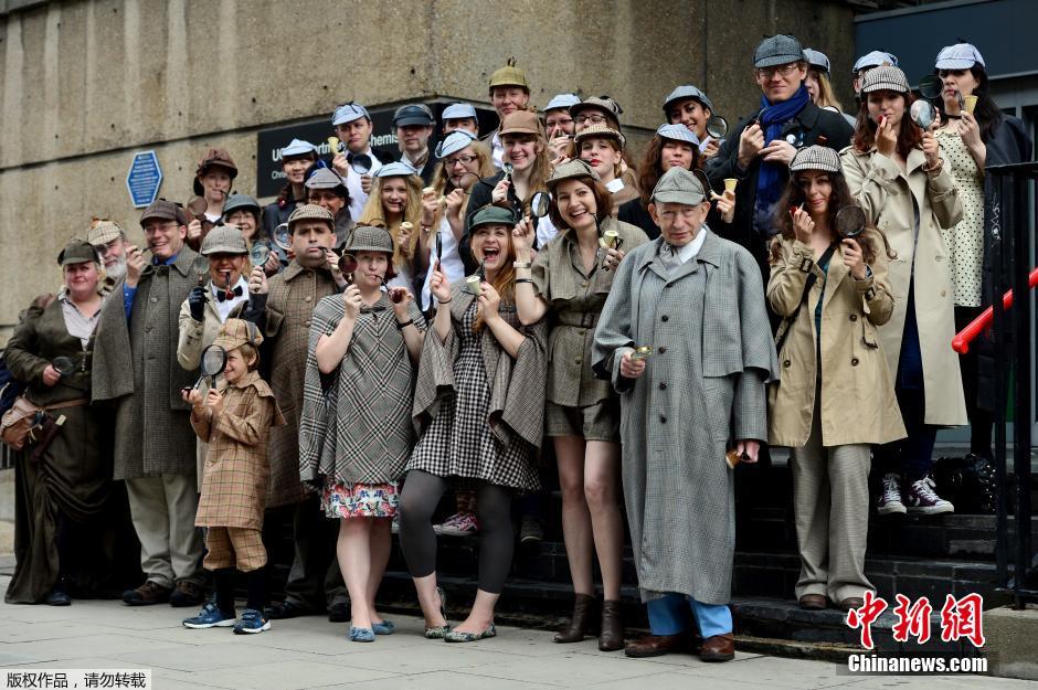 当地时间2014年7月19日,英国伦敦,民众头戴猎鹿帽、身着斗篷、手持烟斗和放大镜,装扮成小说中的虚构人物福尔摩斯,试图创造最多人假扮福尔摩斯集会的吉尼斯纪录。这一活动是由MX出版社为筹款出版一本图书而组织的,该书讲述一家内罗毕孤儿院的故事。书籍出版销售后的全部收入将投入到推广这家孤儿院在肯尼亚孤儿的教育和领养方面的伟大事业中去。
