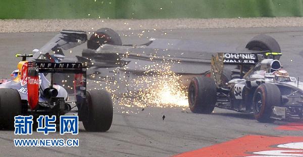 7月20日,威廉姆斯车队车手马萨的赛车在一号弯道翻车。当日,在霍肯海姆举行的2014年F1德国站正赛中,威廉姆斯车队巴西车手马萨在行驶到一号弯道时翻车,退出比赛。 新华社/美联