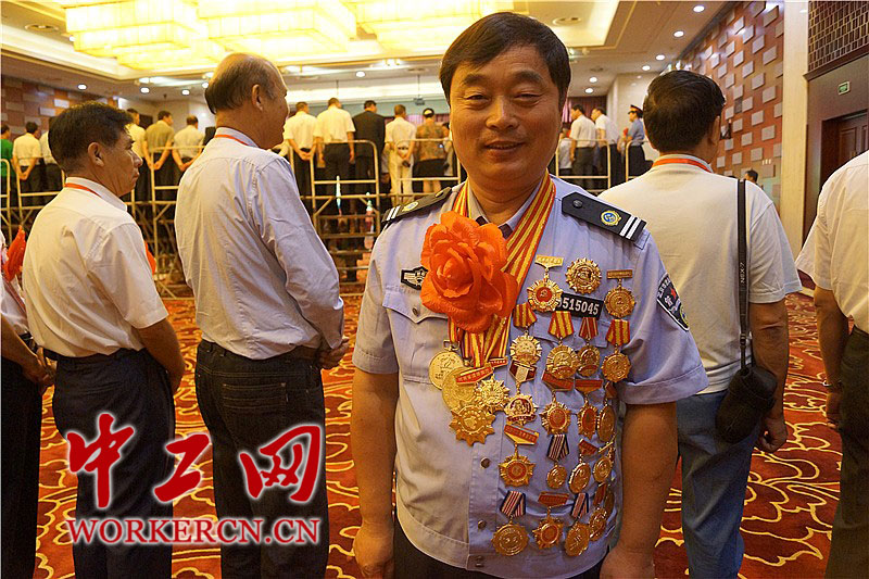 自2000年以来,全总每年暑期都会组织劳模休养,并开展丰富多彩的娱乐活动,让辛勤工作的劳模得到充分休息。劳模休养已成为党和政府关心关爱劳模的重要形式和工会服务劳模的品牌工作。图为来自北京市朝阳区八里庄街道流管办管理员的李高峰,他特意佩戴珍藏的20余枚奖章参加此次休养活动。中工网记者 葛姗 摄
