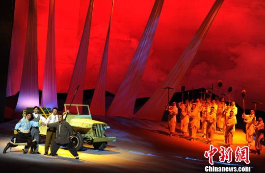7月21日晚,新编现代京剧《七个月零四天》在甘肃大剧院上演。该剧展现了上世纪50年代,时任西北军区进藏部队、西藏运输总队政委的慕生忠将军率领驼工筑路队,修建青藏公路的不朽史诗。据了解,在正值青藏公路通车60周年之际,青海省演艺集团公司精心创作编排了该剧,以此来缅怀先辈们的丰功伟绩,重新点燃激情昂扬的开路火炬。杨艳敏 摄
