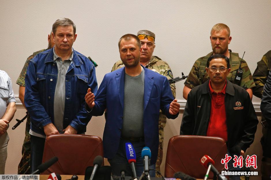 当地时间2014年7月22日,顿涅茨克,“顿涅茨克人民共和国”官员向马来西亚调查人员移交马航MH17航班客机黑匣子。