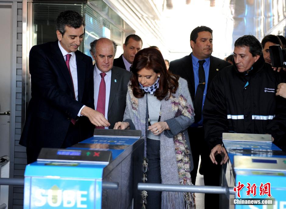 当地时间7月21日,由中国制造的7列新车组首次在阿根廷首都地区萨米恩托城铁线投入运行,阿根廷总统克里斯蒂娜到场祝贺。中新社发 裘征宇 摄