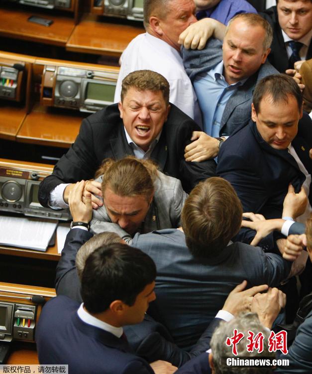 当地时间2014年7月22日,乌克兰基辅,乌克兰执政党与前总统亚努科维奇所在的地区党在在议会上演全武行,当天乌克兰议会经过局部动员通过了一项总统令。