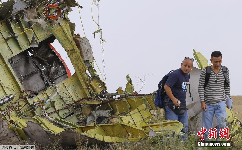 当地时间2014年7月22日,乌克兰顿涅茨克地区,亲俄武装、欧安组织成员以及一支马来西亚空难调查团在坠机现场勘查。
