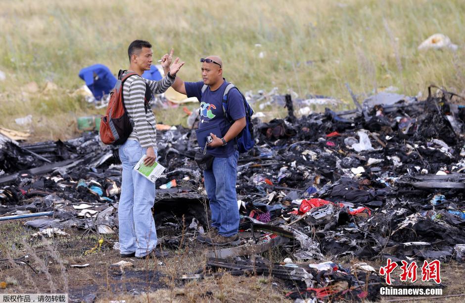当地时间2014年7月22日,乌克兰顿涅茨克地区,亲俄武装、欧安组织成员以及一支马来西亚空难调查团在坠机现场勘查。