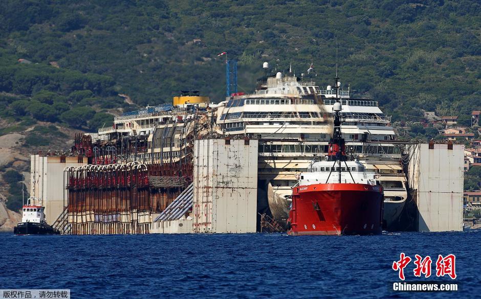 当地时间2014年7月23日,意大利吉廖岛,触礁搁浅豪华游轮康科迪亚号脱浅工作顺利,重新浮上水面,将与23日被拖走历经4天前往热那亚进行拆解工作。