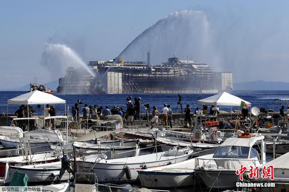 当地时间2014年7月23日,意大利吉廖岛,触礁搁浅豪华游轮康科迪亚号脱浅工作顺利,重新浮上水面,将与23日被拖走历经4天前往热那亚进行拆解工作。