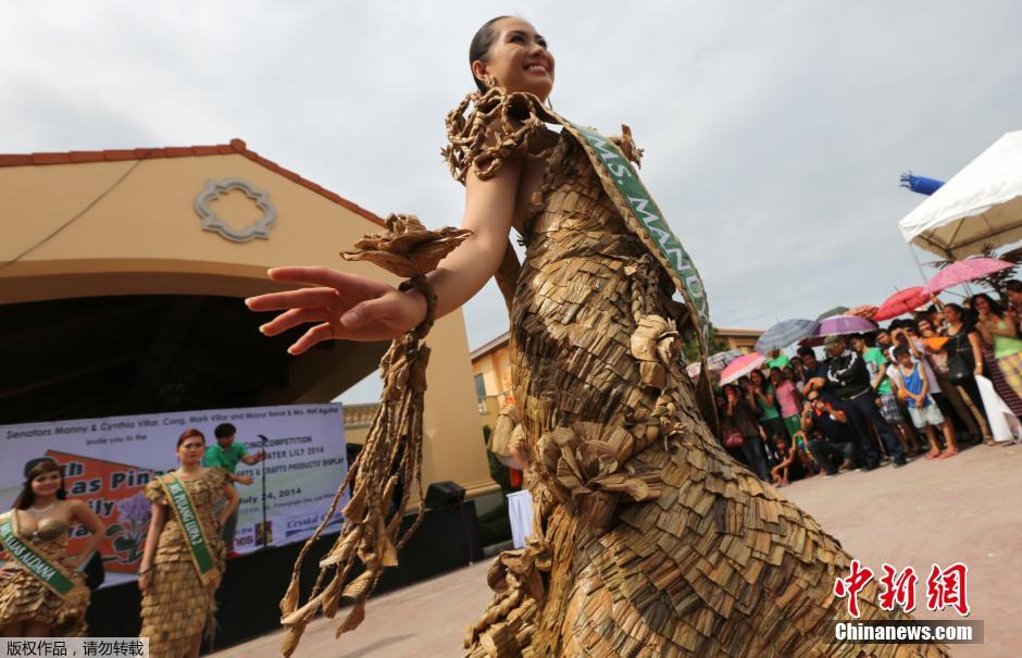 当地时间7月24日,菲律宾马尼拉,睡莲小姐选美大赛候选人身穿由干睡莲叶子制作的礼服展示自己。据组织者称,睡莲小姐选美大赛是为了庆祝一年一度的睡莲节。