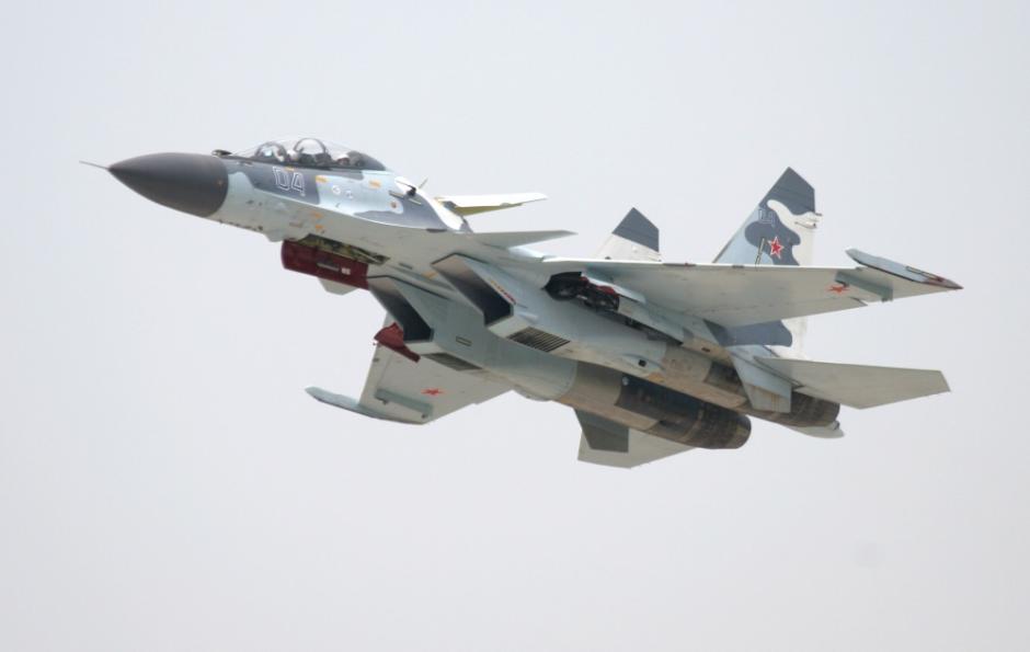 当地时间5月27日,“航空飞镖—2014”战机比赛在俄罗斯沃罗涅什举行,将有来自各军区航空编队和俄空军的71个机组参加,在开幕式上,俄罗斯主力战机将升空表演。图为SU-30战机。