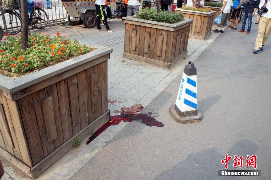7月28日14时31分许,辽宁沈阳市110报警服务中心接到报警称在沈阳北站地区虎跃快客门前有一男子持刀劫持人质。接警后,现场巡逻民警立即开展处置工作,当场将犯罪嫌疑人谢某某(男,39岁,辽宁省辽阳县人)抓获,并成功解救三名被劫持群众。目前,2名受伤群众已送往医院进行救治,案件正在进一步调查之中。图为事发现场一滩血迹。中新社发 于海洋 摄