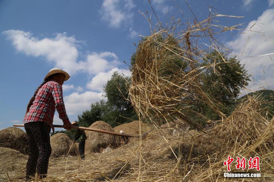 时下,正是甘肃夏收的时节。甘肃清水县境内农民正在拉麦、晾麦、摞麦、碾场、晒粮,用传统的方式“颗粒归仓”。王同堂 摄