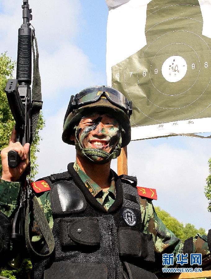 战士李鹏,现为武警上海总队浦东新区支队应急班副班长,担任反恐突击手,擅长射击和特种战术等重点难点课目。“八一”前夕,李鹏所在部队顶着高温进行“大练兵”,同时在全支队开展“谁是兵王”评比活动,李鹏凭借出色的素质和过硬的军事技能被选为“兵王”。李鹏入伍以来,多次荣获“反恐专业能手”、“突击专业优秀学员”称号,代表部队参加重大演练和汇报演示活动,次次出色完成任务,赢得了广泛赞誉。李鹏最爱说的一句话是:当兵就当能打赢的兵。新华社记者 陈飞 摄
