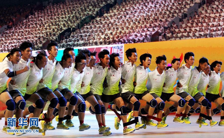 7月28日,各省市“我们一起来”竞跑优胜团队在现场展示。当日,第十二届全国学生运动会在上海东方体育中心拉开帷幕。据了解,本届运动会除设有田径、游泳、篮球等8个竞赛项目外,还增设桥牌等友谊赛。来自各省、自治区、直辖市、新疆生产建设兵团和香港、澳门特别行政区的34个代表团参赛,参会运动员、教练员、裁判员数量达6000余名。新华社记者刘颖摄