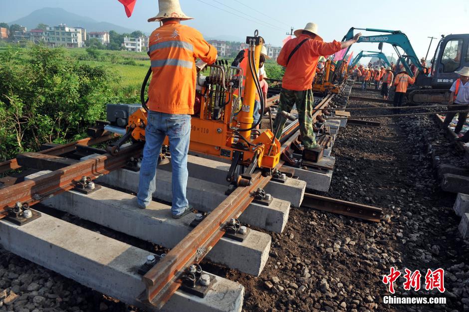 经过约3个小时的紧张作业,皖赣铁路最后一组“木枕道岔”全部更换成“清一色”的水泥枕木。与此同时,该铁路原有的有缝钢轨全部升级为无缝钢轨,实现全线无缝化。